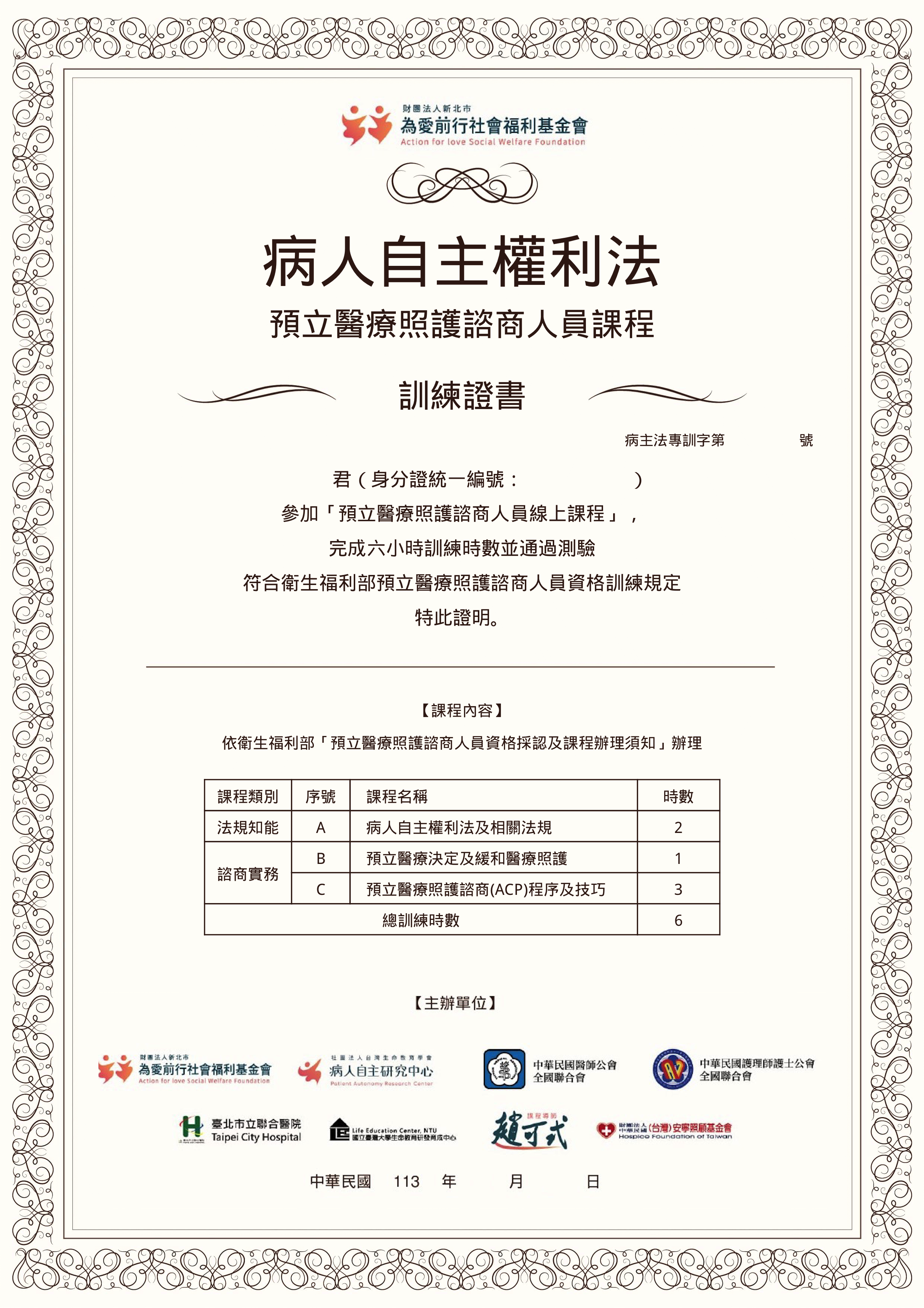 認證項目:預立醫療照護諮商人員訓練時數/繼續教育積分